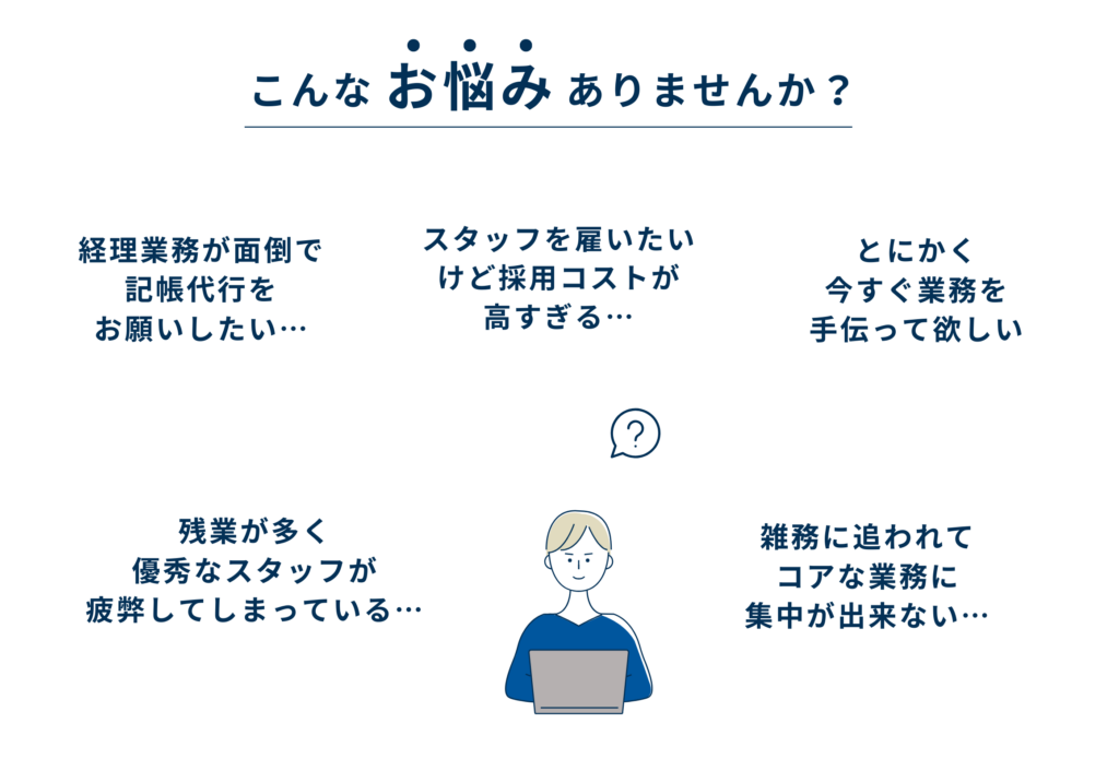 普段だと自分でやってしまったり、依頼し難かった事務・秘書・経理から、Web運用やデザイン業務などの全てをまとめてご依頼頂けます。
